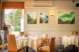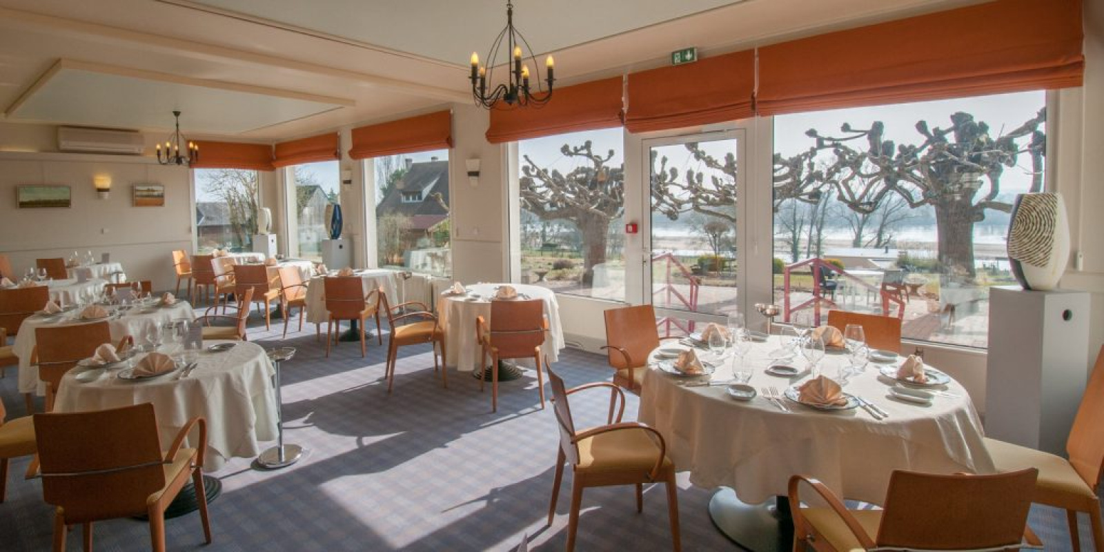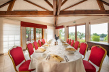 Au rez-de-chaussée, une vaste réception avec un espace bar et salon qui s'ouvre sur une salle de restaurant entièrement vitrée, offrant une vue imprenable sur la terrasse et la Loire.
