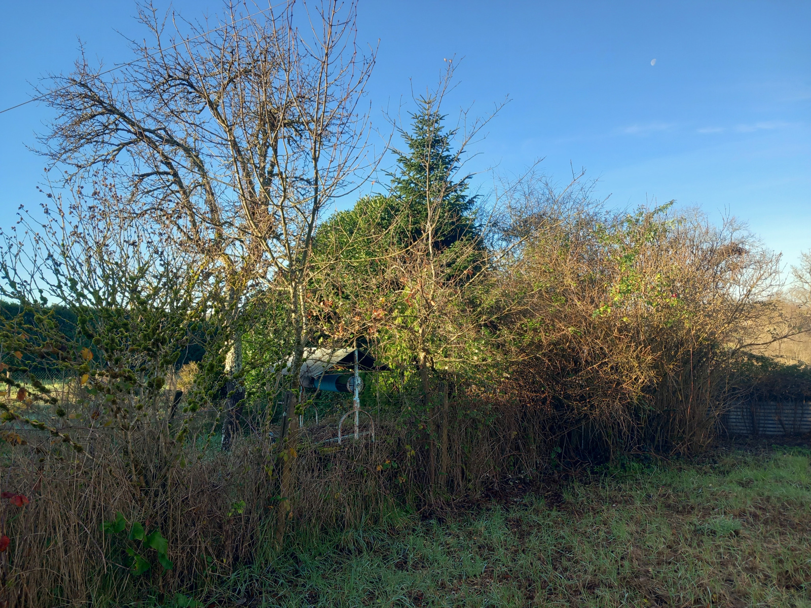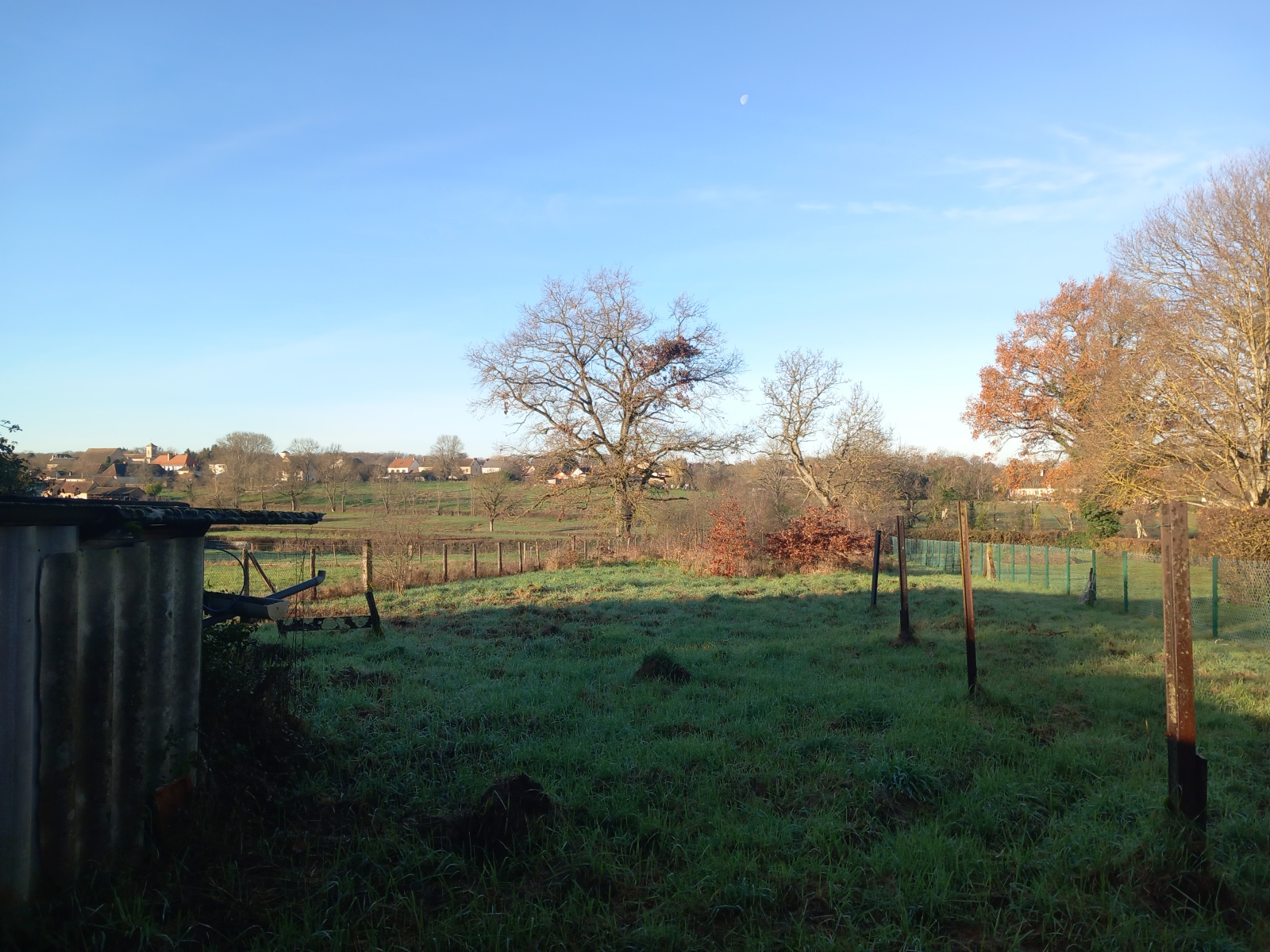 Terrain clos et arboré avec petites dépendances, vue sur la campagne environnante.