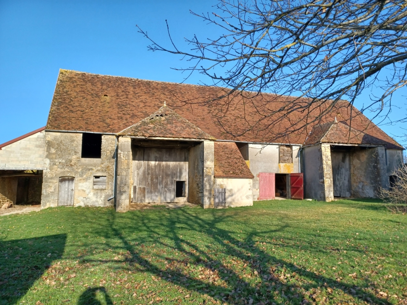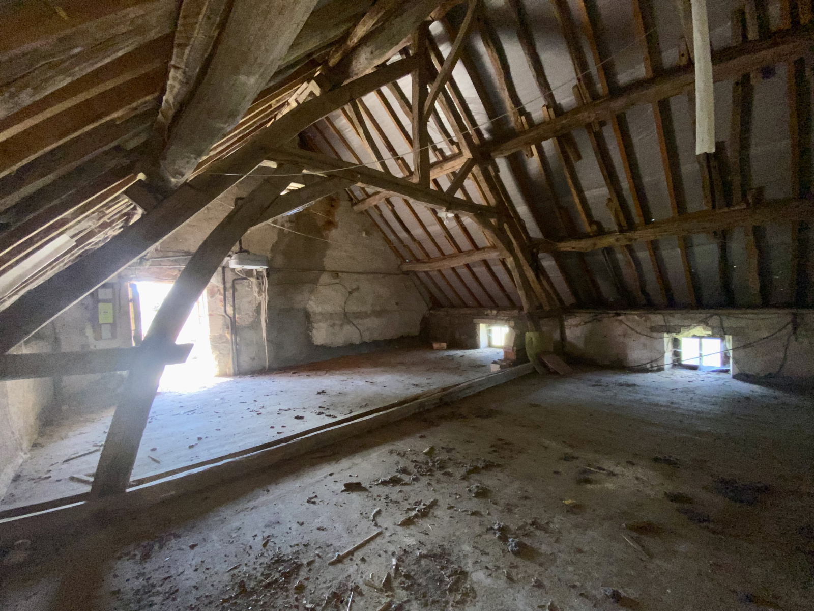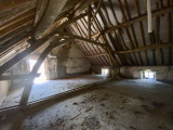 Établie sur un terrain de 5 288 m² environ, elle comprend une maison principale avec poutres apparentes et cheminées, trois grandes pièces, un grenier aménageable et une cave. Une grange pleine de potentiel
