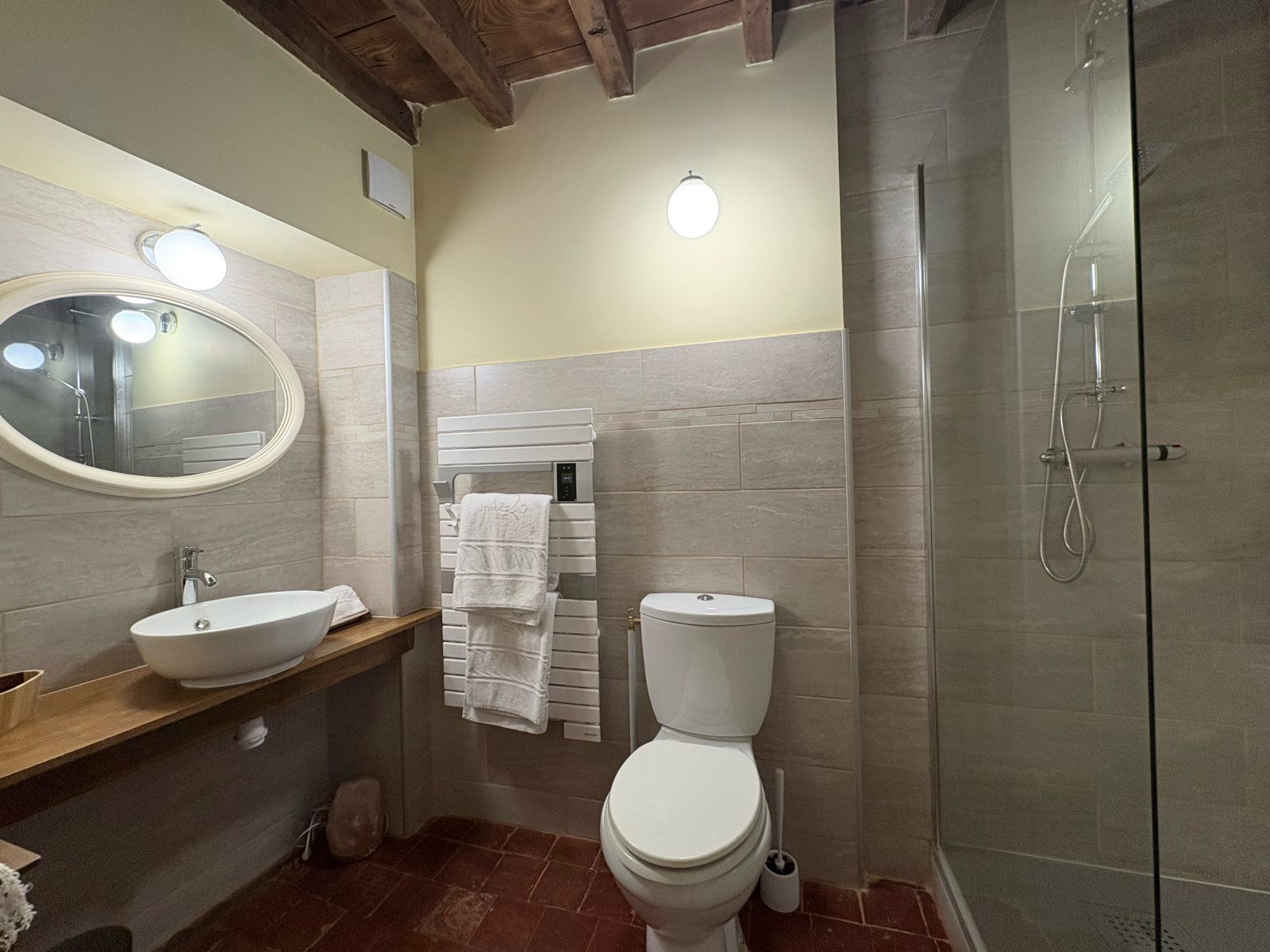 Au rez-de-chaussée, une agréable pièce de vie avec sa cuisine entièrement équipée et neuve, offrant un accès direct à une sympathique terrasse.