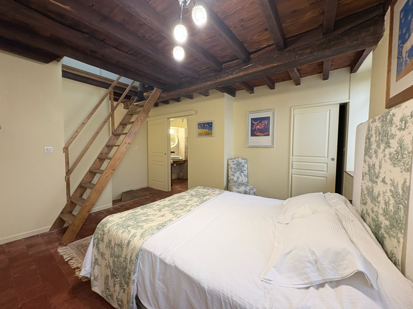 À l’étage, un superbe escalier d’origine restauré mène à une chambre avec sa salle de bains et son dressing.